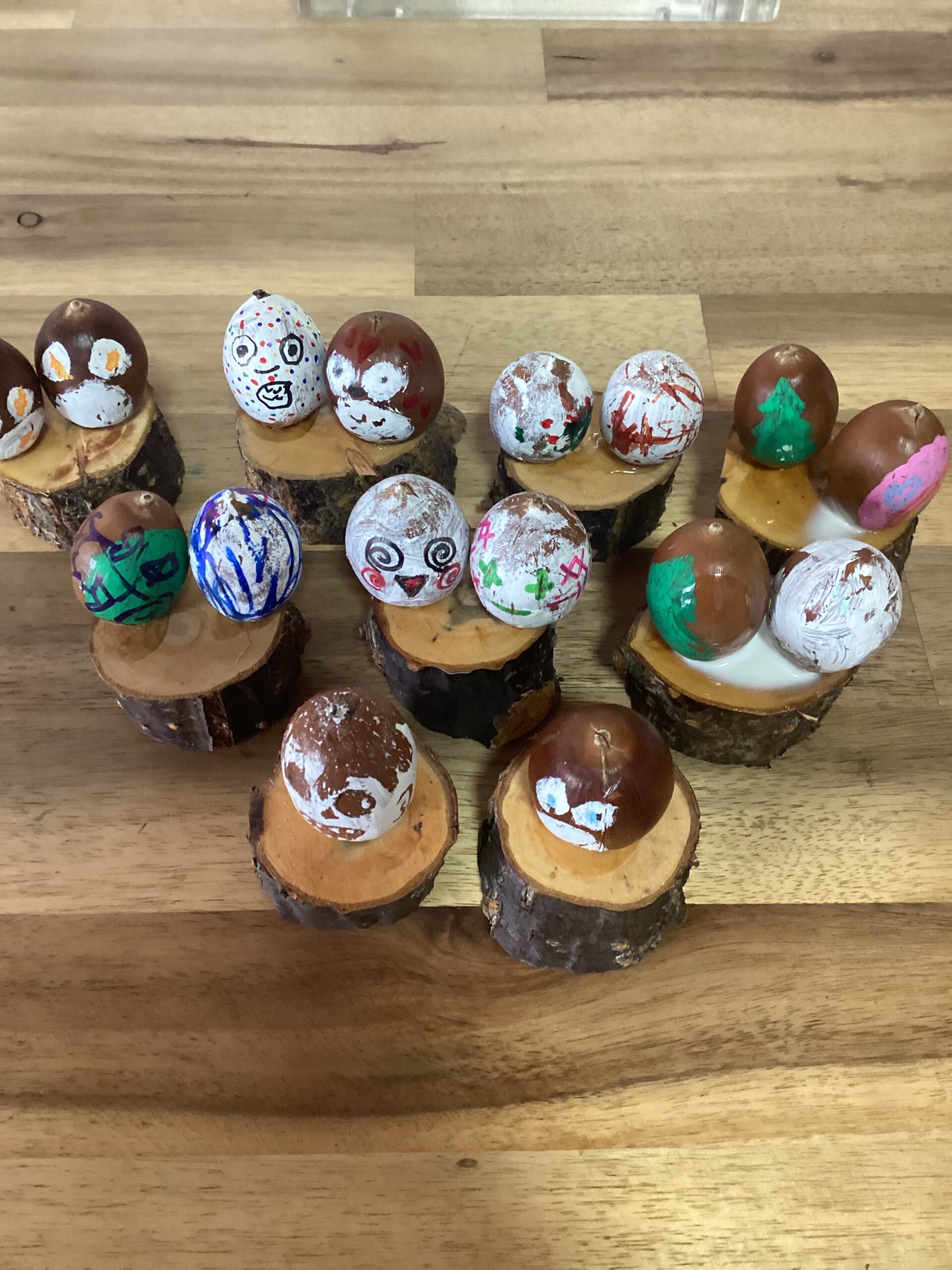 11月に入り、落ち葉が色づき、秋が感じられるようになりました。PEACEでは、落ち葉狩りや、秋の自然物を見つけながら歩行訓練を行いました。今回は、どんぐりで作ったかわいらしい置物を紹介します。みんなでどんぐりに顔を描いてどんぐりトトロを作ったり、クリスマスツリーや、雪だるまを描き、小さな丸太につけて作りました。子ども達それぞれ一生懸命に取り組み、オリジナルの作品ができました。今後も、落ち葉や松ぼっくりなどを使い何か創作できたらと考えています。